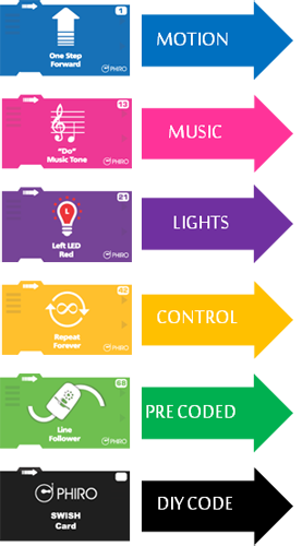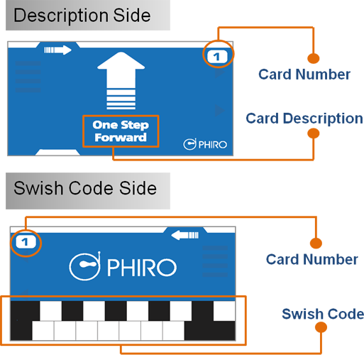 Swish Cards are coding cards that you can use to program Phiro robots. Each Swish Card makes Phiro do something!